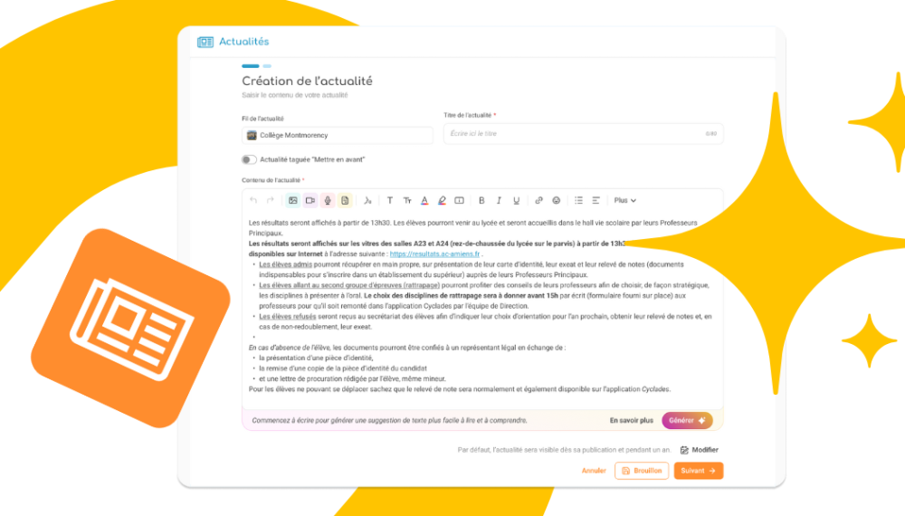 - Rédaction : Vous rédigez votre article dans Actualités via l’éditeur multimédia (minimum 200 caractères pour garantir la pertinence de la reformulation).