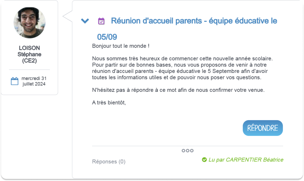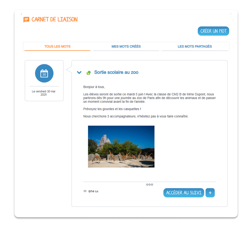 Matériel à ne pas oublier, réunions importantes ou sorties scolaires, transmettez tous les mots importants aux parents d’élèves via le Carnet de liaison.