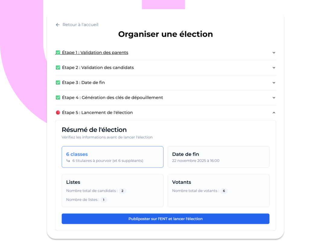 Plus besoin d’imprimer des convocations, de monter une urne ou de passer votre soirée à dépouiller des bulletins. Vous préparez le scrutin en quelques clics : création automatique de la liste électorale qui s’importe à partir de la console d’administration de l’ENT, création des listes des candidats, test de la solution avec simulation de dépouillement et lancement.