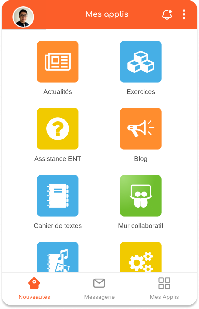 Tout comme dans la version web sur la page “Mes Applis”, les couleurs des icônes des applications de votre ENT se parent de nouvelles couleurs dans votre app mobile. Orange pour communiquer, bleu pour produire des ressources pédagogiques, vert pour s’organiser, jaune pour administrer, et violet pour les applications phares.