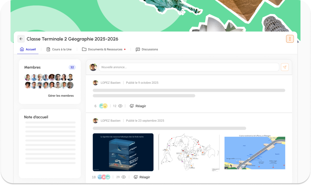 Désormais, vous pouvez communiquer directement les informations importantes aux membres de votre communauté en postant un message dans ce fil d’annonces. Changement de salle ? Ajout d’une Carte mentale ou d’un lien intéressant dans l’onglet “Documents et ressources” ? Un rapide message permet d’alerter les élèves.