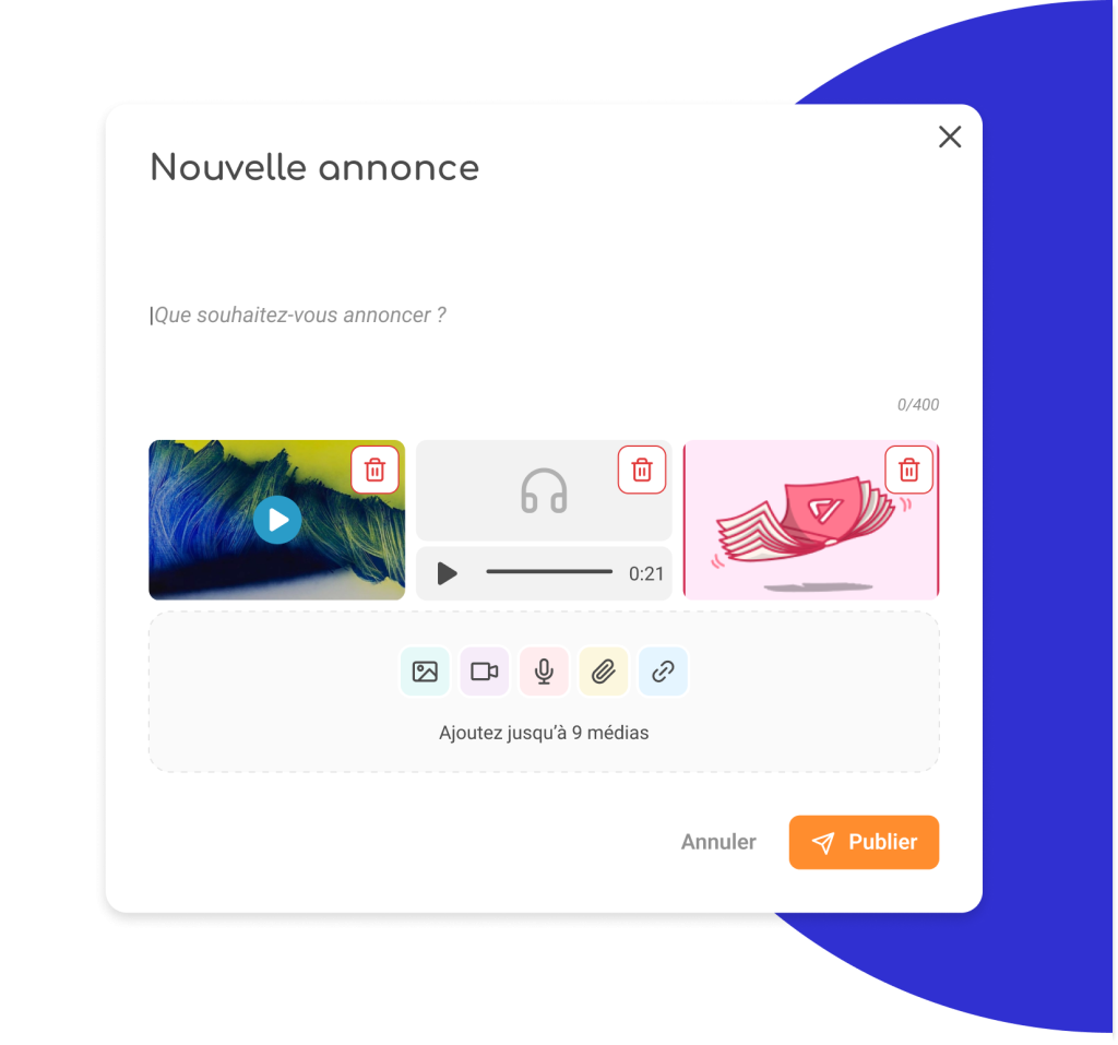 La fonctionnalité vous permet également de joindre des images ou vidéos pour illustrer votre message. Vous pouvez ajouter jusqu’à 9 médias ou pièces jointes à chaque annonce. Notez que les pièces jointes ici ne seront pas disponibles dans l’onglet « Documents et ressources ».