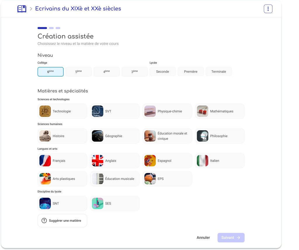 L’enseignant choisit le niveau, la matière, le sujet, ajoute s’il le souhaite un thème de personnalisation. L’IA génère en quelques minutes une séquence, que l’enseignant peut ensuite compléter, modifier et partager à l’envi.
