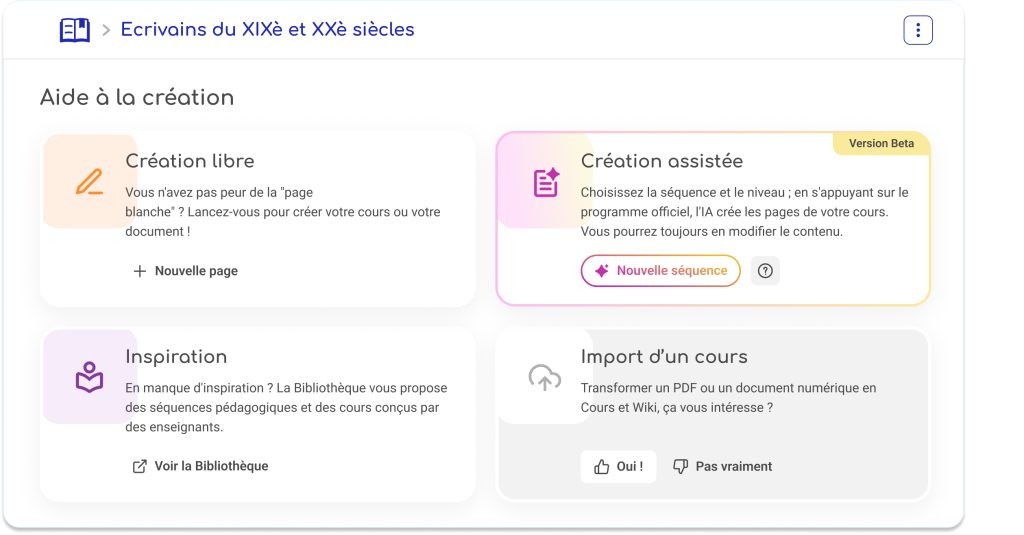 Notre application Cours et Wiki change ! Lors de la création d’un nouveau cours, l’enseignant de collège ou de lycée découvre une nouvelle page d’accompagnement, avec plusieurs possibilités :