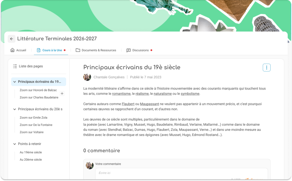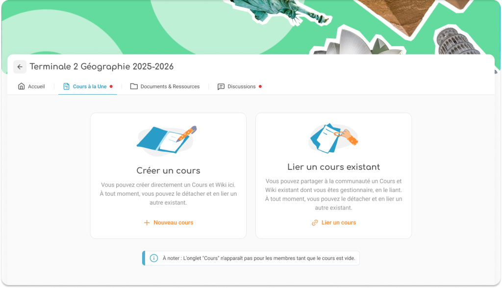 Évolution très attendue par nos bêta-testeurs de la nouvelle version de Communautés : l’onglet Cours à la une a été activé. Il permet aux enseignants gestionnaires d’une communauté de lier le cours du moment et de le mettre ainsi en avant dans un onglet dédié.