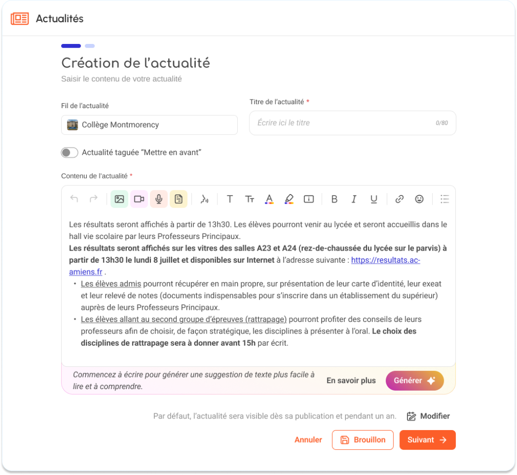 Édifice s’engage pour une école plus inclusive en intégrant une assistance à la rédaction utilisant l’intelligence artificielle et inspirée de plusieurs méthodes de simplification de l’écriture, notamment le FALC (Facile A Lire et à Comprendre) et la Language clair. Présentée sur le salon Educatech 2025, cette fonctionnalité nous a été inspirée par nos partenaires de la Région Hauts-de-France. Elle a pour objectif d’accompagner les auteurs d’actualités dans la rédaction de textes facilement compréhensibles par le plus grand nombre.