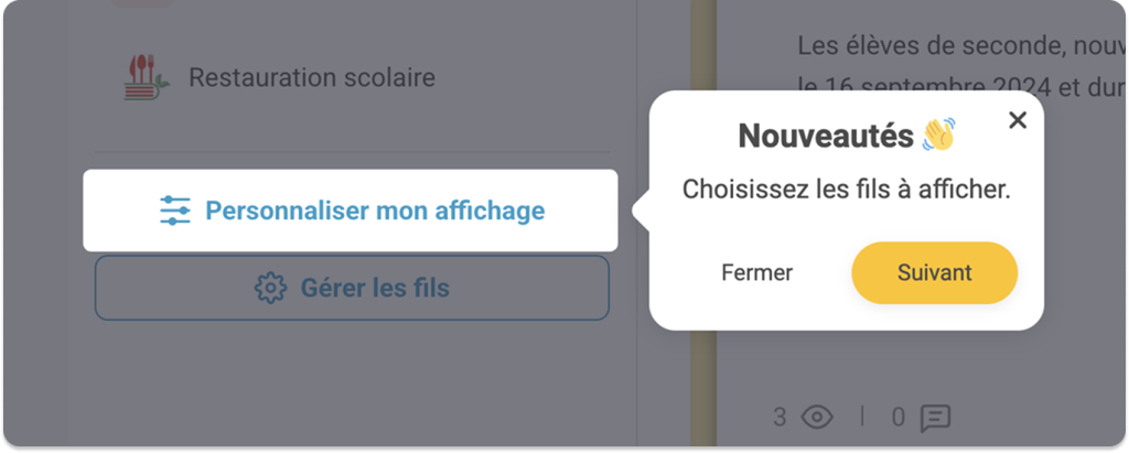 Le bouton “Personnaliser mon affichage” permettra à ces administrateurs de choisir d’afficher ou non les fils auxquels ils ont accès, en cochant ou non la case correspondante. La vue est modulable à l’envi en fonction de leurs besoins.