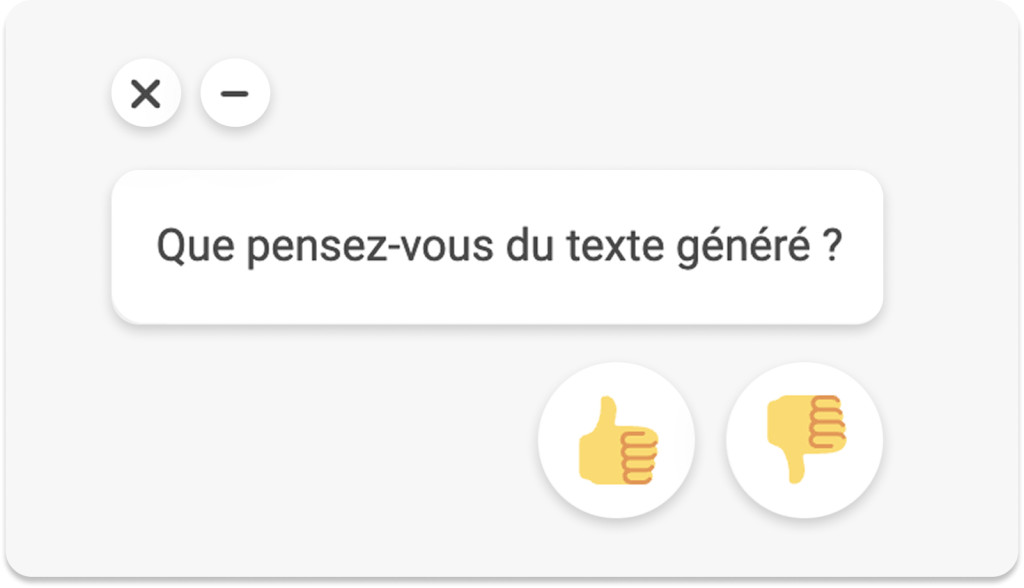 Il peut ensuite noter le résultat généré par l’IA, en répondant à la modale qui s’affiche en bas à gauche de la page. Les réponses récoltées sont bien sûr anonymes et hébergées en France. Elles nous permettront d’améliorer l’outil de génération afin de mieux l’adapter aux besoins des rédacteurs.